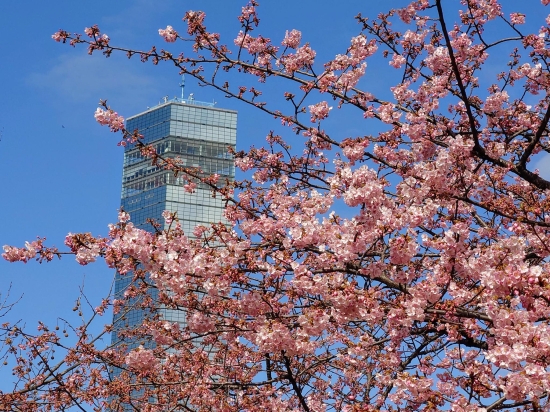 2月中旬の千葉ポートタワーです。野外ステージ脇のピンクの河津桜が青空に映えて綺麗だったので一緒に撮りました。