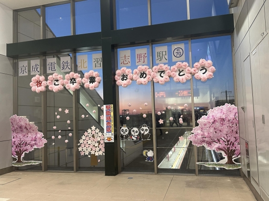 夕暮れに映える卒業生へ贈ることば。 ガラスに散る花びらひとつずつに駅員さんたちのことばが書かれている。 この駅で乗り降りした生徒ばかりではなく、保護者もきっと涙したはず。 照る日、曇る日、雨の日、風の日、よくぞ無事で卒業式を迎えられました。本人も、育てた方もお疲れ様です。これからもっと辛いことや苦しいことが待っているだろうけれど、頑張っていきましょ。