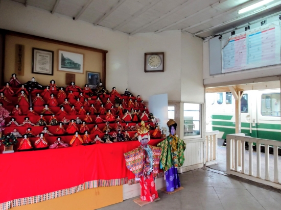 3月上旬の上総鶴舞駅です。駅舎内に置かれた雛飾りと、白と緑のキハ40男鹿色を一緒に撮りました。
