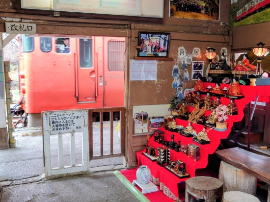 3月上旬の里見駅です。首都圏色と言われるキハ40が入線し、ホームに停車したので、雛飾りと一緒に撮りました。