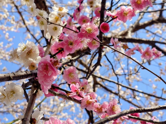 3月上旬の平和公園です。桜が有名な平和公園ですが、梅も咲いていました。白梅を撮ろうとしたら、同じ木の枝に紅梅も咲いていてびっくり!青空を入れてアップで撮りました。
